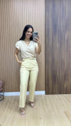 Descrição da peça: Calça estilo Pantalona em linho, com bolsos laterais e bolsos fake nas costas, botão e zíper como fechamento e possui um cinto de corda com detalhes em lurex e miçangas trazendo um charme a mais a peça.